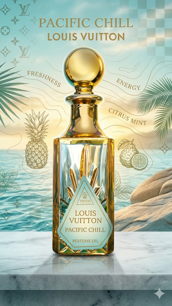 Pacific Chill by Louis Vuitton is a Aromatic Fruity fragrance for women and men. Pacific Chill was launched in 2023. The nose behind this fragrance is Jacques Cavallier Belletrud. Top notes are Citron, Orange, Lemon, Mint, Black Currant and Coriander; middle notes are Apricot, Basil, Carrot Seeds and May Rose; base notes are Fig, Dates and Ambrette.